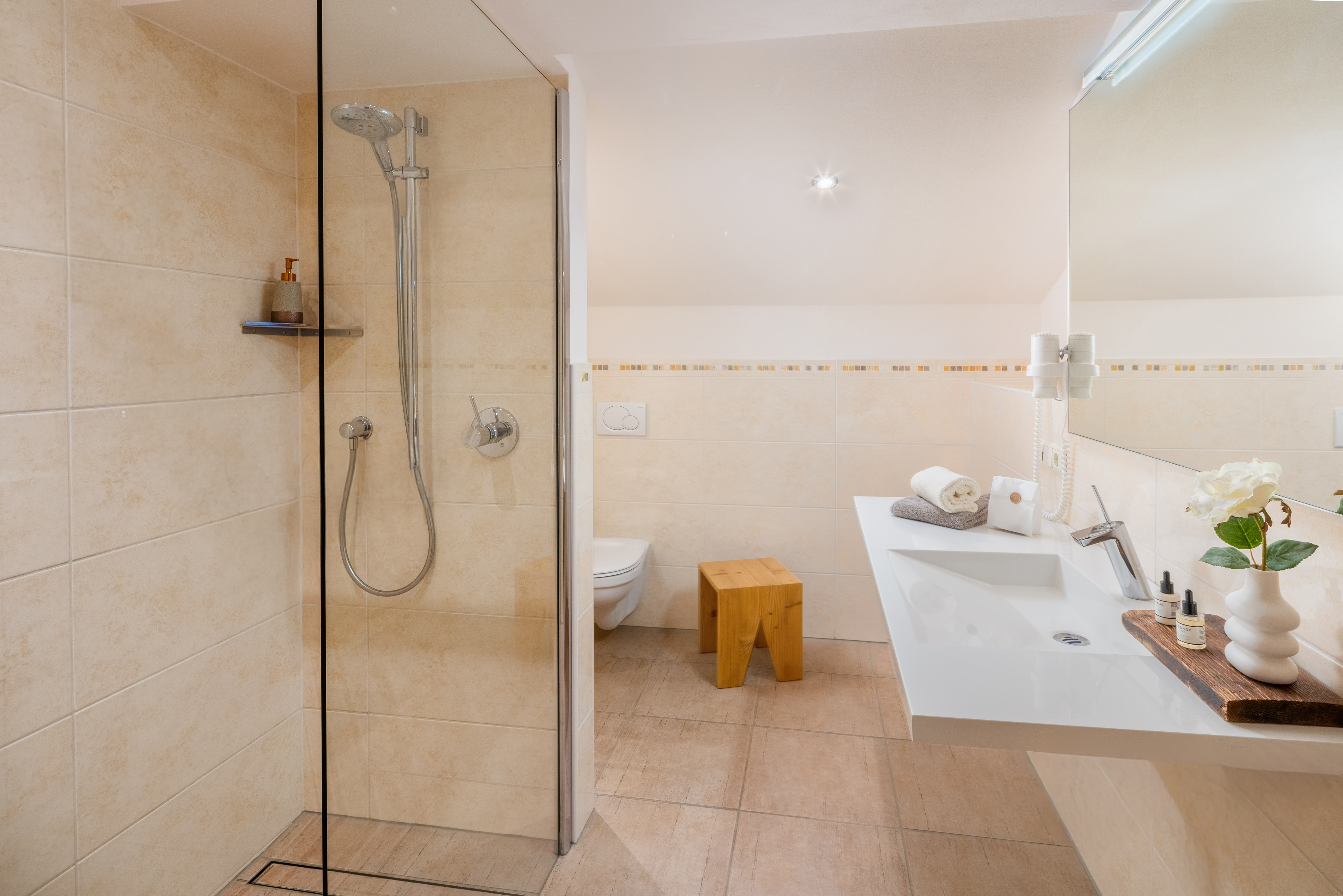 Wohlfühlbad mit bodenebener Dusche und WC, Waschtisch, Handtuchtrockner, warmer Fußboden, Bio-Kosmetikartikel, Fön, WC-Papier